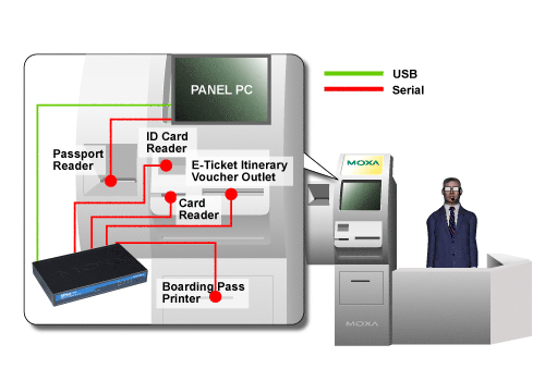 此系統(tǒng)使用一臺(tái)IBM小型計(jì)算機(jī)來(lái)控制kiosk,它帶有一個(gè)串行端口和二個(gè)USB口。問(wèn)題是系統(tǒng)一共要使用到5 個(gè)不同的串行設(shè)備(護(hù)照讀卡器、電子客票打印機(jī)、登機(jī)牌打印機(jī)、身份證讀卡機(jī)和俱樂(lè)部卡讀卡機(jī)) 。為了連接這些硬件,他們使用MOXA的UPort 1410,4串口轉(zhuǎn)USB Hub,可以通過(guò)一個(gè)USB口增加4個(gè)串口,同時(shí)無(wú)需打開(kāi)電腦機(jī)箱。